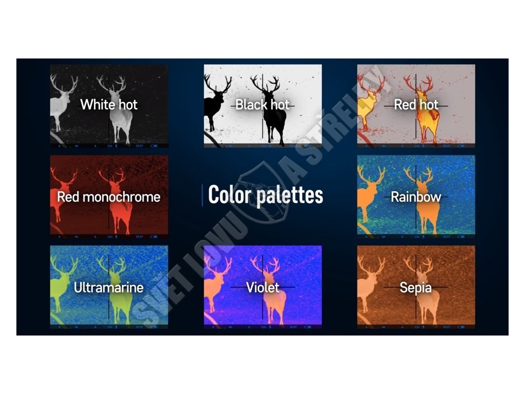 Pro snadnější pozorování jsou v nabídce přístroje různé barevné palety zobrazení, které odpovídají konkrétním podmínkám během lovu. Kromě oblíbených režimů White Hot a Black Hot jsou zde kupříkladu režimy Red Hot, Rainbow a Ultramarine, které zvýrazňují intenzivnější teplá místa. Naproti tomu Violet, Red Monochrome nebo Sepia jsou ideální palety pro snížení únavy očí během delšího pozorování.