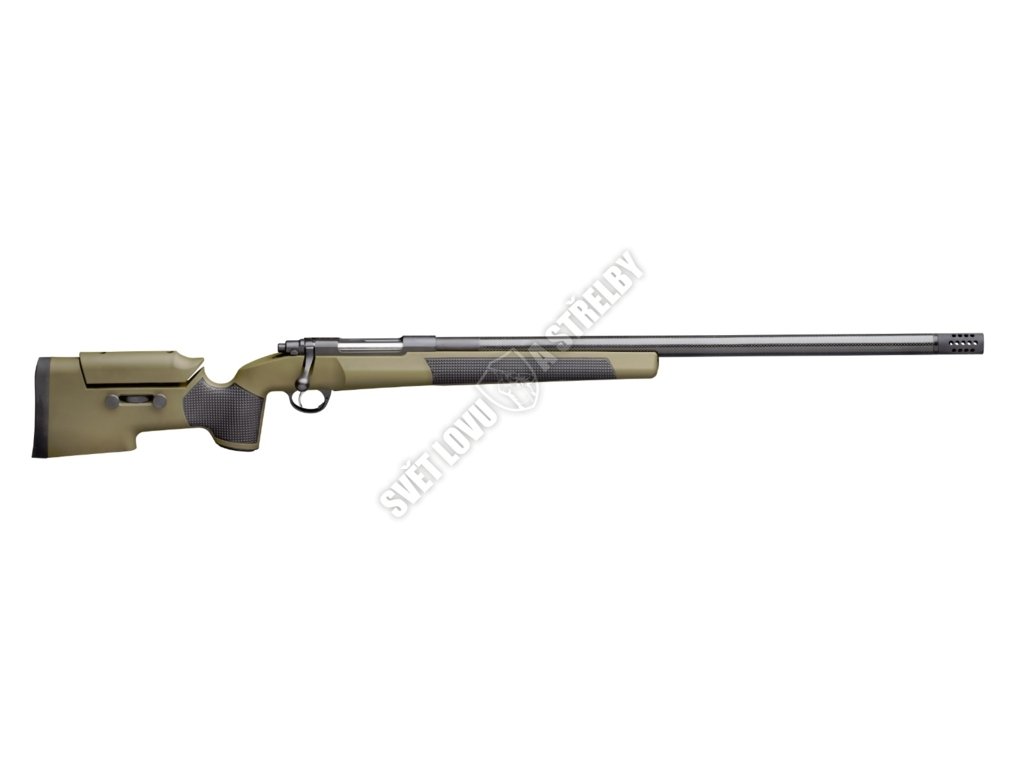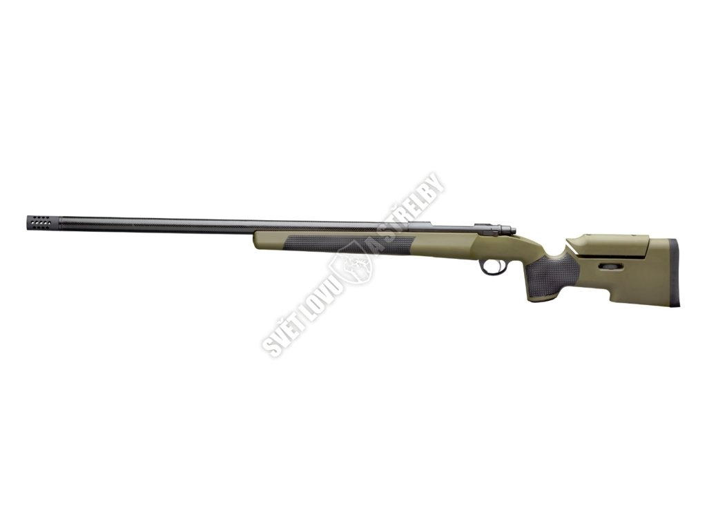 Polymerová pažba v olivově zelené barvě s karbonovými prvky má stavitelnou lícnici (výškově i stranově). Spoušť je s napínáčkem.